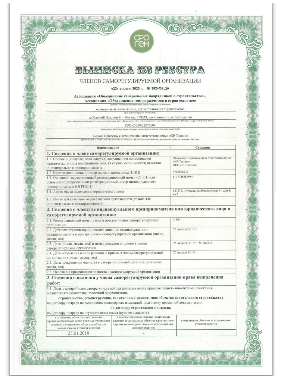 При выполнении строительно - монтажных работ компания "КР-Техник" использует современное оборудование и материалы. Персонал компании имеет все необходимые документы и допуски, что обеспечивает гарантию и качество производимых работ.